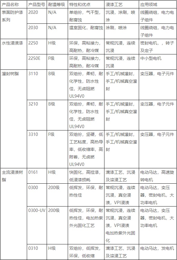 主流浸漬樹脂系列:0161,0300,0300-UV,0310,雙組份,低揮發,環保,常規沉浸,涂刷,噴涂施工,用于電動馬達,變壓器,密封電機,大功率電機;
